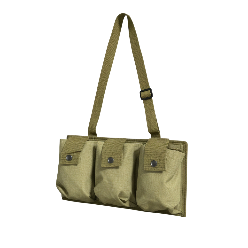 A shoulder worn bandolier pouch designed to securely carry three magazines, providing quick access and stable retention during movement. Built for military and tactical use with a durable construction suitable for demanding environments.